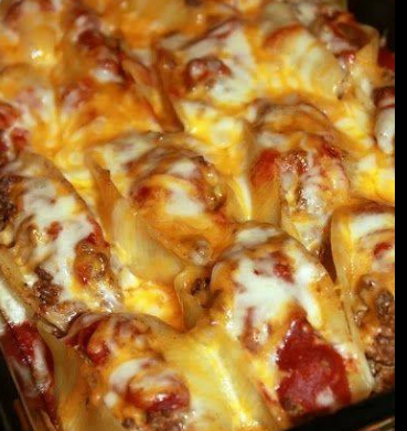 Stuff the shells with the mix and place in a baking pan. Cover with sauce.