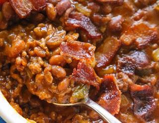 Add the pork and beans, barbecue sauce, ketchup, mustard, Worcestershire sauce, soy sauce and brown sugar to the mixture. Simmer mixture for 5 minutes. Transfer the mixture to the prepared casserole dish.