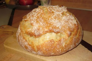 Take the hot pot from the oven and gently place the dough into the pot. Cover with the lid and return to the oven and bake for 30 minutes. Remove the lid at that time and return the pot to the oven for another 10-15 minutes. Gently shake the loaf onto a cooling rack and enjoy the beautiful aroma. Give it a chance to cool before cutting into the loaf.