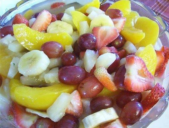 In a large bowl, combine peaches, pineapples, and vanilla pudding mix. This includes the juices from the cans. Mix well until pudding is dissolved. Stir in strawberries, banana, blueberries, grapes, and sugar if desired. Chill.