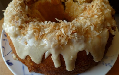 Drizzle glaze over the crunchy top portion of cake. Top with toasted coconut if desired.