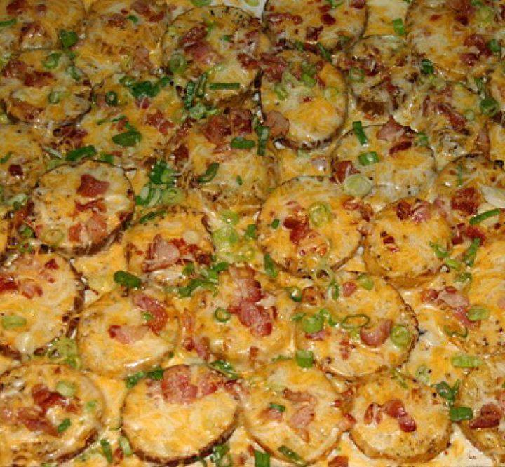 When potatoes are ready, top with bacon, cheese, and green onion; continue baking until the cheese has melted (I just turned the oven off and let the heat melt it all). Serve with sour cream if desired Enjoy!!