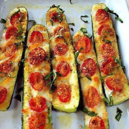 Slice the zucchini in half. Slice off the bottom to keep in stable. Brush with olive oil and top with garlic or garlic powder. Top with sliced tomatoes, salt and pepper to taste. Use mozzarella cheese, Parmesan cheese or mixed blend.. Bake 375 for 20 to 30 minutes until soft.
